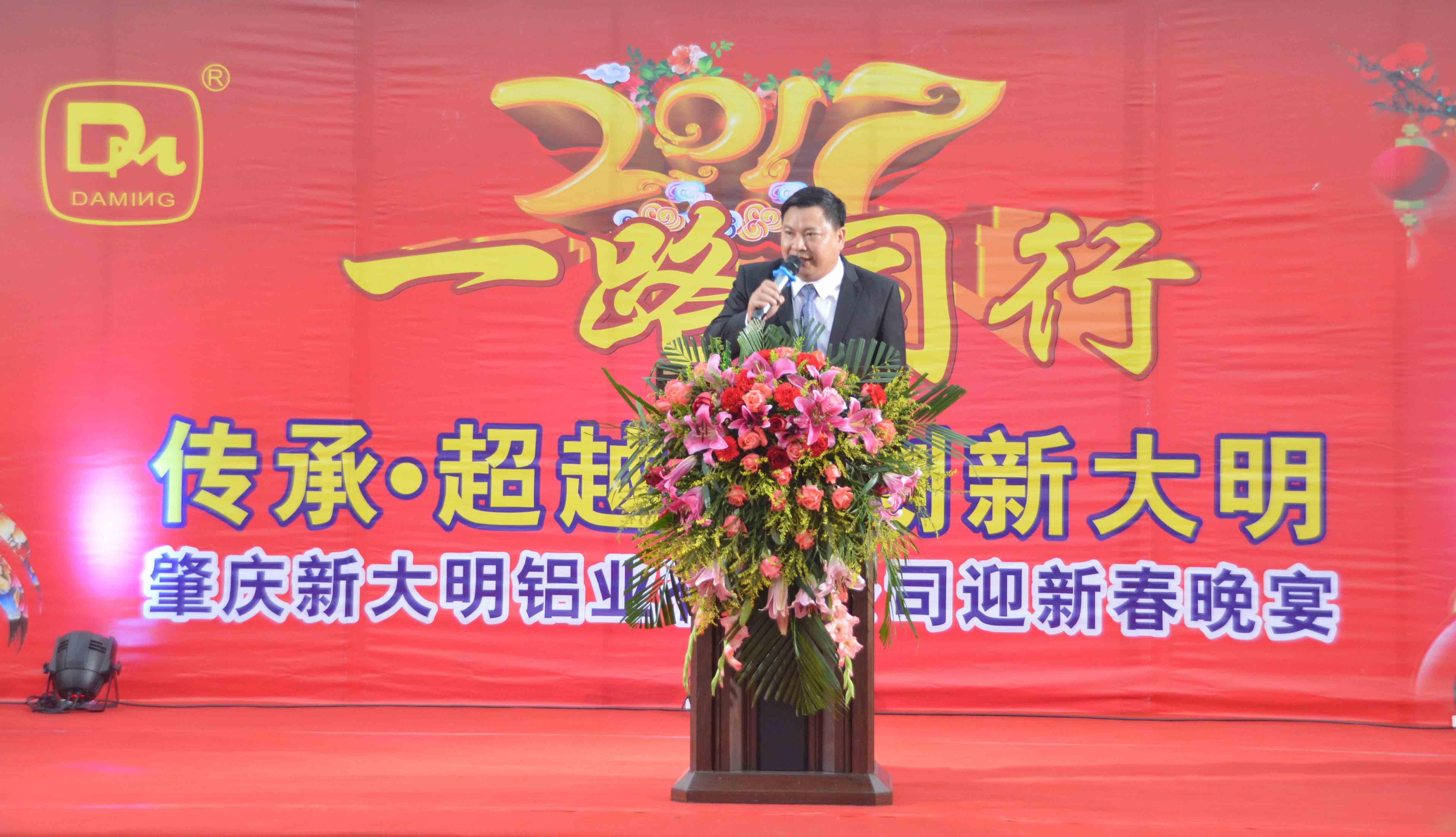 满怀着激动与自豪的心情,董事长古先生率先致辞。在向莅临现场的嘉宾表示欢迎的同时,他回顾了新大明公司一年来,销售业绩持续稳步增长的历程。他说,2016年是极不平凡的一年,在公司董事会的领导下,经过全体“大明人”的辛勤劳动和努力拼搏,各方面的工作均取得了较好的成绩。首先,在经济形势不容乐观的情况下,公司的整体运营状况依然呈现良好的发展态势,公司不断地开拓新市场,并与多家上市公司和大型的门窗企业建立了友好的合作关系;其次,公司顺利完成了旧厂的搬迁和新厂的对接工作,熔铸、挤压和喷涂车间的生产规模不断扩大;更令人期待的是二期工程正在全面建设当中,这是一个重要的里程碑,必将为新大明的发展和壮大提供支撑和保障。