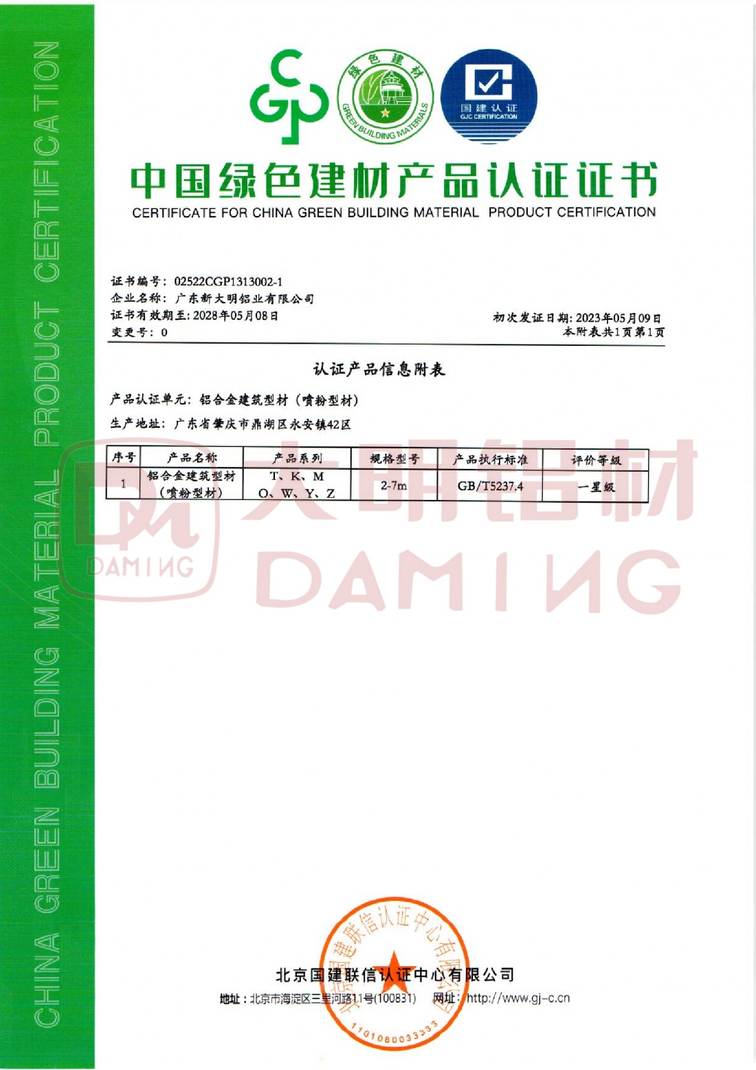 中国绿色建材产品认证证书